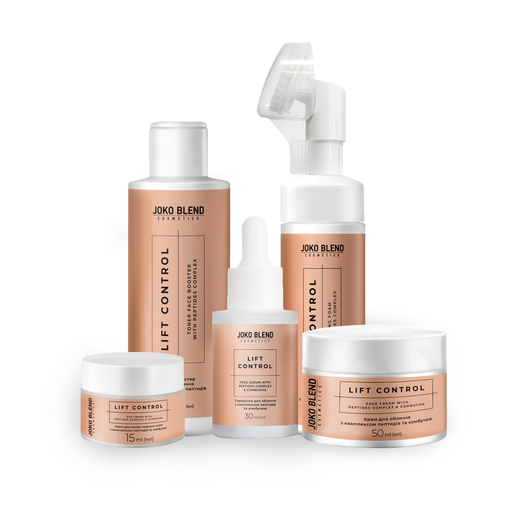 Тонер-бустер для обличчя з комплексом пептидів Lift Control Joko Blend 150 мл - комплекс пептидів - гіалуронова кислота - Д-пантенол - алантоїн - екстракт морських водоростей Сироватка для обличчя з комплексом пептидів та комбучею Lift Control Joko Blend 30 мл - комплекс пептидів - ферментований чорний чай Комбуча - вітамін Е - Д-пантенол - алантоїн - гіалуронова кислота - екстракт морських водоростей Крем для шкіри навколо очей з комплексом пептидів та комбучею Lift Control Joko Blend 15 мл - комплекс пептидів - ферментований чорний чай Комбуча - вітамін Е - Д-пантенол - алантоїн - гіалуронова кислота - екстракт морських водоростей Крем для обличчя з комплексом пептидів та комбучею Lift Control Joko Blend 50 мл - комплекс пептидів - ферментований чорний чай Комбуча - вітамін Е - Д-пантенол - алантоїн - гіалуронова кислота - екстракт морських водоростей Пінка для вмивання з комплексом пептидів Lift Control Joko Blend 150 мл - комплекс пептидів - Д-пантенол - екстракт морських водоростей