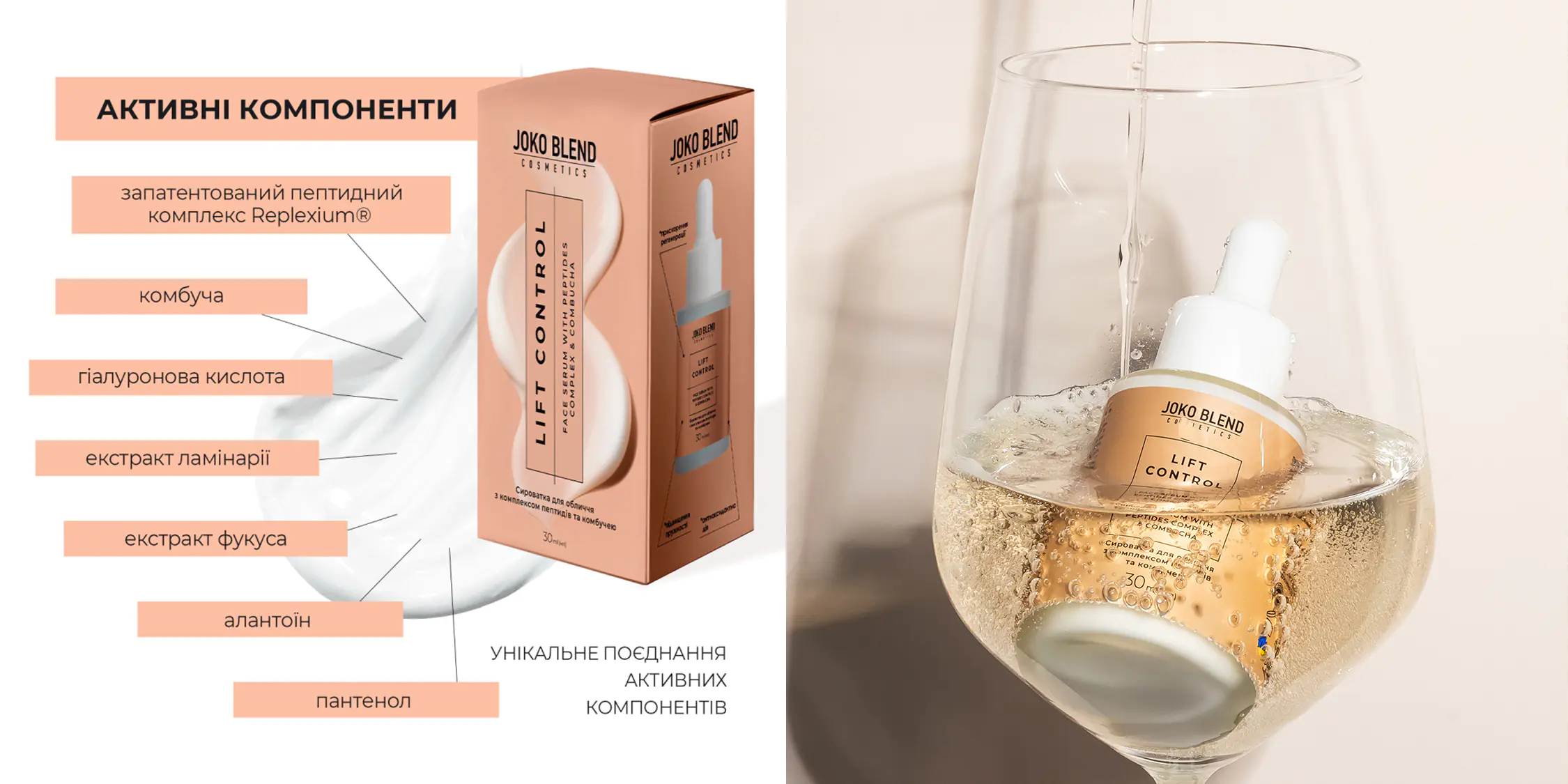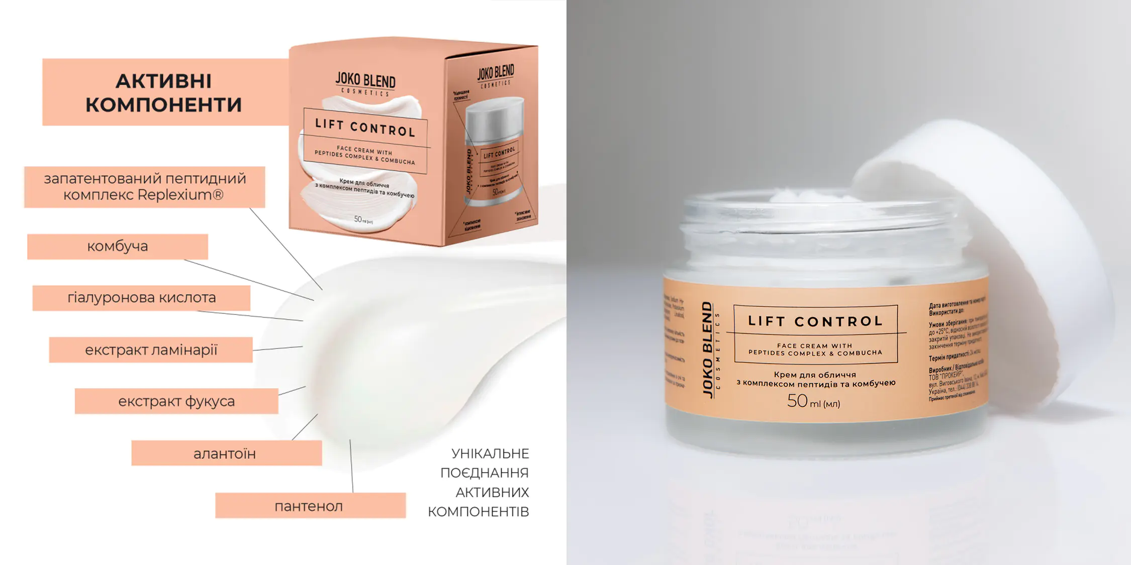 Комплекс антивіковий LIFT CONTROL від Joko Blend — це повноцінна система догляду, спрямована на зміцнення, зволоження та омолодження шкіри. Унікальний комплекс пептидів Replexium® у поєднанні з ферментованим чорним чаєм комбуча, гіалуроновою кислотою та екстрактами морських водоростей інтенсивно працює над покращенням пружності, еластичності та тону шкіри. Засоби сприяють синтезу колагену та еластину, допомагають зменшити вираженість зморшок, усувають сліди втоми та роблять шкіру гладкою, підтягнутою та більш сяючою.