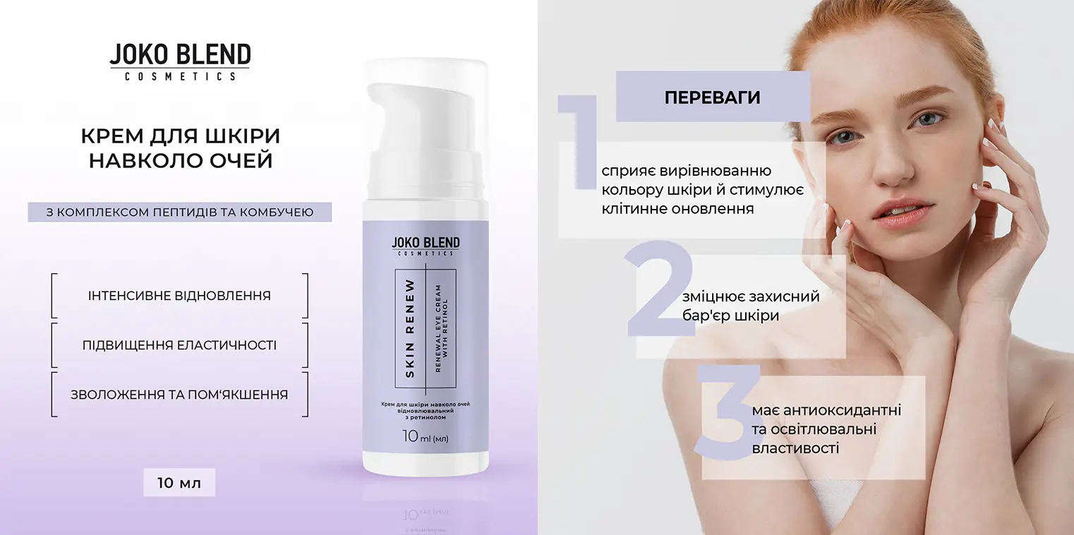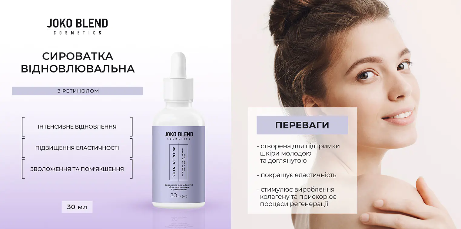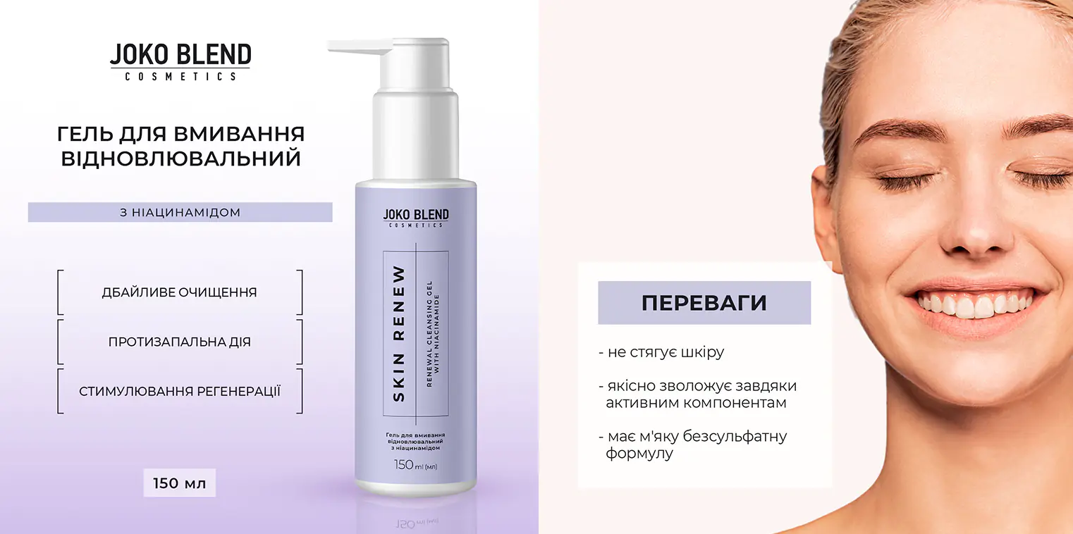Гель для вмивання відновлювальний з ніацинамідом Skin Renew Joko Blend 150 мл - пантенол - ніацинамід - екстракт розмарину - екстракт барбариса - екстракт женшеня Крем для обличчя відновлювальний з ретинолом Skin Renew Joko Blend 30 мл - сквалан - ніацинамід - ретинол - гіалуронова кислота Крем для шкіри навколо очей відновлювальний з ретинолом Skin Renew Joko Blend 10 мл - мочевина - ніацинамід - пантенол - масло Ши - гіалуронова кислоти - екстракт зеленого чаю Сироватка для обличчя відновлювальна з ретинолом Skin Renew Joko Blend 30 мл - сквалан - ніацинамід - ретинол - гіалуронова кислота Тонер для обличчя відновлювальний з ніацинамідом Skin Renew Joko Blend 150 мл - ніацинамід - екстракт центелли - екстракт годжі - пантенол -