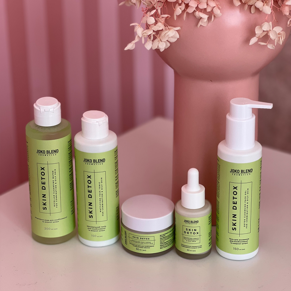 Мицеллярная вода для комбинированной и жирной кожи Skin Detox Joko Blend 200 мл: экстракт ламинарии, аллантоин, пантенол. Гель для умывания для комбинированной и жирной кожи Skin Detox Joko Blend 150 мл: ниацинамид, цинк, экстракт ламинарии, аллантоин, пантенол. Матирующий тоник для комбинированной и жирной кожи Skin Detox Joko Blend 150 мл: ниацинамид, экстракт ламинарии, аллантоин, пантенол. Балансирующая сыворотка для комбинированной и жирной кожи Skin Detox Joko Blend 30 мл: бакучиол, ниацинамид, экстракт зеленого чая, витамин Е, экстракт аннатто, аллантоин, пантенол. Матирующий крем для комбинированной и жирной кожи лица Skin Detox Joko Blend 50 мл: бакучиол, ниацинамид, экстракт зеленого чая, витамин Е, экстракт аннатто, аллантоин, пантенол. -